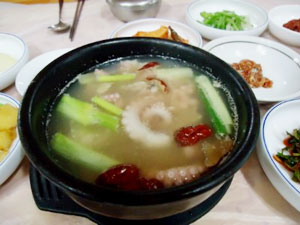 독천시장에 가면 낙지집이 십여 군데가 넘는데, 맛에도 큰 차이가 없다고 한다. 살아있는 세발낙지를 먹는 것이 부담스럽다면 갈비탕에 세발낙지를 통째로 넣은 '갈낙탕'을 권한다. 갈낙탕은 간을 많이 하지 않는 음식이라 원재료가 좋아야 한다. 갈낙탕 1만7000원.