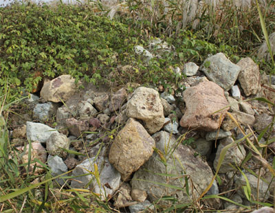 길 건너편에는 언뜻 보면 잡풀이 수북하게 자라고 있었다. 주변에는 갈대밭까지 있어 좋은 풍광을 연출하기도 했다. 그러나 풀숲을 헤치자 폐석이 수북이 쌓여 있는 모습이 나타났다. 대형 트럭으로 집중적으로 투기됐을 것으로 추정되는 각종 폐석은 군집을 이루며 하천변에 약 30m의 길이로 길게 뻗혀 있었다.