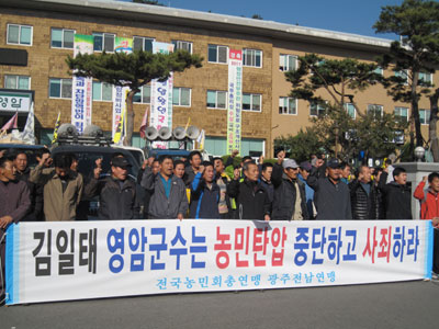 이날 시위에서 박재택 회장은 “농업과 농민들의 먼 미래를 내다보며 장기적인 안목과 관점을 가지고 책정하고 집행되어야 할 예산이 한 단체의 시위가 못마땅하다 하여 예산삭감 협박을 하는 것은 지나가던 소가 웃을 일”이라며 “과연 영암군이 농업과 농촌에 대한 발전 정책이 있기는 한 것인지 의심스럽다”고 주장했다.