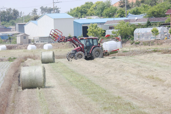 지난 21일 군서면에서 서호면까지 들판 위에는 거침없이 달리는 트랙터들이 둥근 원통형 모양의 건초 사일리지를 쉴 새 없이 만들어내고 있었다. 도로변에는 건초더미를 가득 실은 트럭이 줄을 이루고 있고 논과 도로 사이를 분주히 오가는 주민들의 손에도 어김없이 건초더미가 들려 있었다.