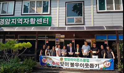 영암라이온스클럽(회장 서영준)은 추석맞이 불우이웃돕기 행사로 지역의 어려운 독거노인 중에서도 외롭게 추석을 맞이하는 독거노인과 부모의 사랑이 그리운 조손가정 아이 등 50명에게 송편과 음식을 전달해달라며 영암지역자활센터에 후원금을 기증했다.