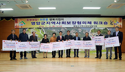 영암군 지역사회보장협의체 워크숍 직전에 열린 이번 연합모금 기탁식에서는 ▲영암읍문예체육행사추진위원회(회장 임상문) 50만원 ▲영암낭주농협 행복나눔봉사단(조합장 이재면) 50만원 ▲군서면 김재준씨 50만원 ▲미암면 문기정씨 50만원 ▲미암면발전위원회(회장 김정근) 50만원 ▲(주)그린특수산업(대표 정기동) 50만원 ▲가수 두바퀴(대표 홍주연) 70만원 ▲(주)기영축산(대표 이주영) 100만원 ▲정수농장(대표 김정수) 100만원 ▲(주)팜드림(대표 박상철) 100만원 ▲서호면 유재학씨 100만원 ▲신북면 이장단(단장 강임구) 150만원 ▲㈜ 광전피씨(대표 이정덕) 200만원 ▲왕인식품(대표 박정희) 250만원 등이 기부되었다.
