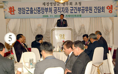 영암군은 22일 재경영암군향우회(회장 홍정석)의 초청으로 서울시청 앞 프레지던트 호텔에서 김일태 군수를 비롯한 실과소장과 지역출신 유선호 국회의원, 그리고 중앙부처 영암출신 공직자 등 90명이 참석한 가운데 군정발전 모색을 위한 정책간담회를 가졌다.<사진>