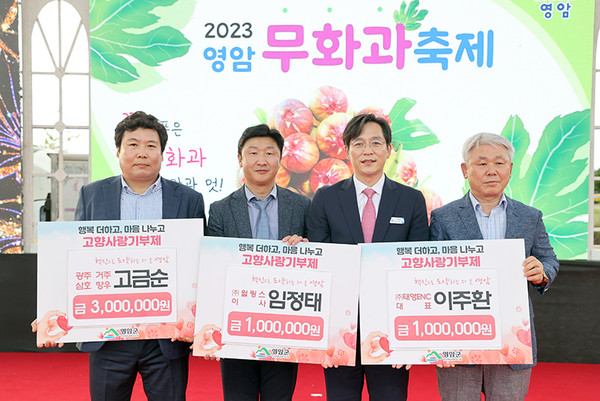 15일 무화과축제 행사장에서는 삼호읍 향우 고금순 씨가 300만 원을, 임정태 ㈜ 윌링스 이사가 100만 원을, 이주환 ㈜태영ENC 청주 대표가 100만 원을 기부했다.