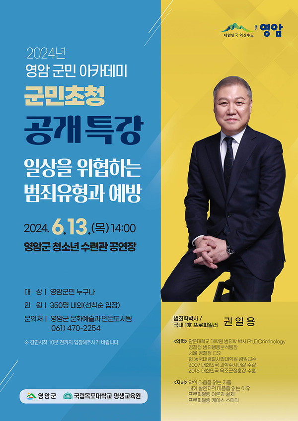영암군은 오는 13일 오후 2시 청소년수련관 공연장에서 프로파일러 권일용 교수를 초청, ‘일상을 위협하는 범죄유형과 예방’을 주제로 ‘군민 아카데미’ 공개특강을 실시한다.