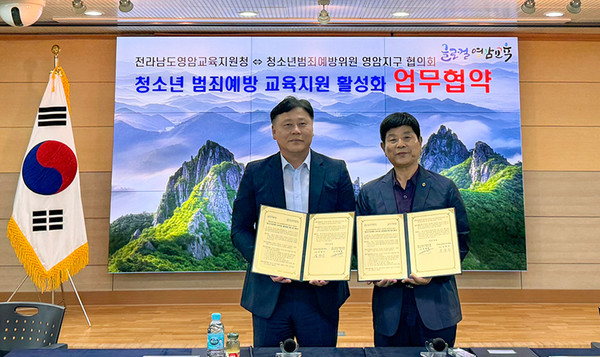 영암교육지원청(교육장 김광수)과 청소년범죄예방위원 영암지구협의회(회장 허행환)는 지난 9일 관내 학생들의 올바른 준법정신 함양과 청소년 범죄예방을 위한 업무협약(MOU)을 체결했다.