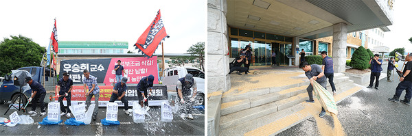“우승희 군수 규탄” 외치며 나락 뿌려