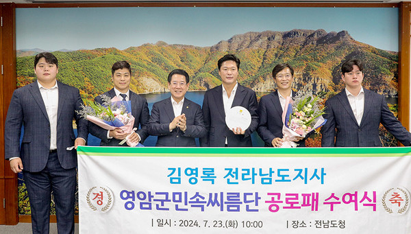 김영록 전라남도지사는 23일 오전 도청 접견실에서 영암군민속씨름단에 전남 우수농수산물 홍보에 대한 감사의 뜻으로 공로패를 수여했다.<사진>