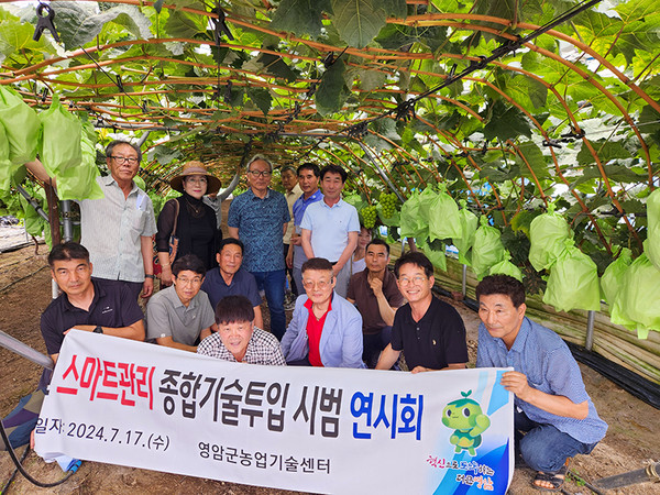 영암군은 17일 금정면의 한 농가에서 포도 재배 농가 20명이 참석한 가운데 ‘시설 과수원 스마트관리 종합기술투입 시범사업 연시회’를 열었다.
