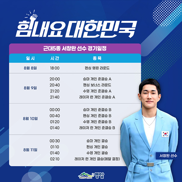 영암군은 제33회 올림픽 근대5종 각 종목 결승이 열리는 11일 군청 왕인실에서 군민 응원전을 개최키로 했다. 펜싱·수영·승마·사격·레이저런으로 구성된 근대5종 국가대표인 서 선수는 영암읍 출신으로 최근 세계 대회에서 발군의 성과를 거뒀다.