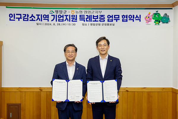 영암군은 27일 낭산실에서 농협은행 영암군지부(지부장 임정빈)와 ‘인구감소지역 기업지원 특례보증 업무협약’을 체결했다.