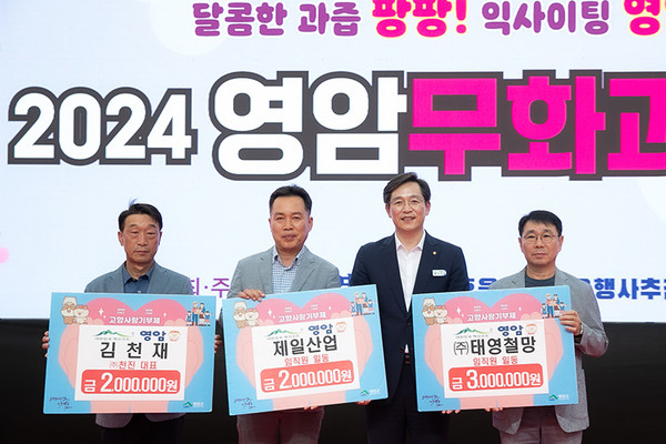 6일 무화과축제장에서는 노정래 ㈜태영철망 대표가 300만 원, 김천재 ㈜천진 대표와 김선애 제일산업 대표가 각각 200만 원을 영암군에 기탁했다.
