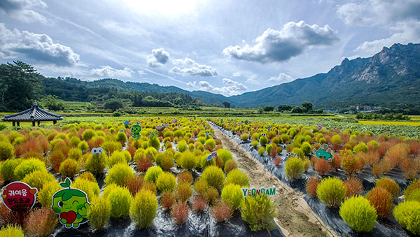 아침저녁으로 제법 서늘해져 가을을 느끼게 하는 요즘, 월출산 아래 영암읍 월비마을에 초록에서 붉은 옷으로 갈아입고 있는 댑싸리가 동글동글 귀여운 자태를 뽐내고 있다.