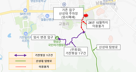 국립공원공단 월출산국립공원사무소는 지난 7월부터 2026년 10월까지 기존 산성대 탐방로 입구로 이어지는 길을 통제하고 국민여가캠핑장에서 시작하는 우회 탐방로(기찬묏길 1구간)를 이용해 줄 것을 밝혔다.