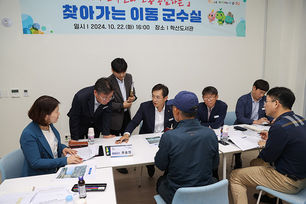 우승희 군수는 지난 22일 학산도서관에서 ‘이동 군수실’을 운영하고 독천리 공용주차장 포장 문제, 학계리 진입로 가드레일 설치 등 주민 의견을 청취했다.