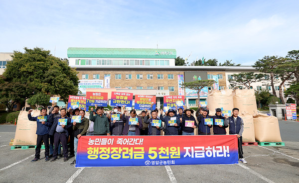 이들은 “농민생존권 무시하는 영암군을 규탄한다” “나락값 대책 없는 농협을 규탄한다” “떨어지는 쌀값에 농민들은 죽어간다” 등의 문구가 새겨진 팻말을 들고 구호를 외쳤다.