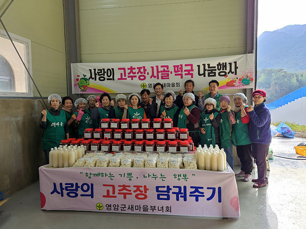 영암군새마을회(회장 박찬)와 새마을부녀회(회장 안석심)는 21일 새마을회관에서 ‘사랑의 고추장․사골․떡국떡 나눔’ 봉사활동을 가졌다.