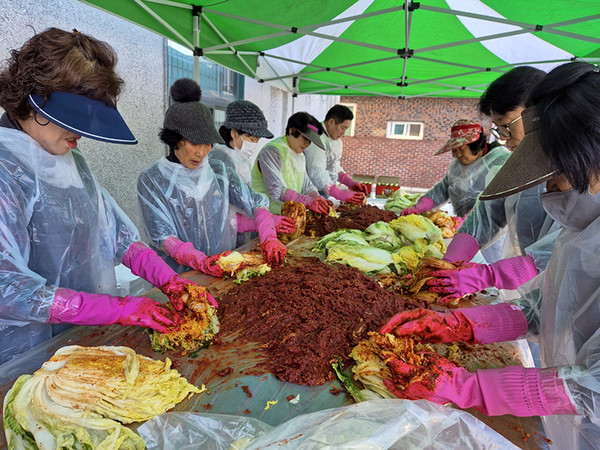 이날 30여 명이 참석한 가운데 김치통 150개를 만들어 관내 독거노인과 복지시설, 마을 공동급식이 이뤄지는 영농회관 71개 등 취약계층에 골고루 나눠줬다.