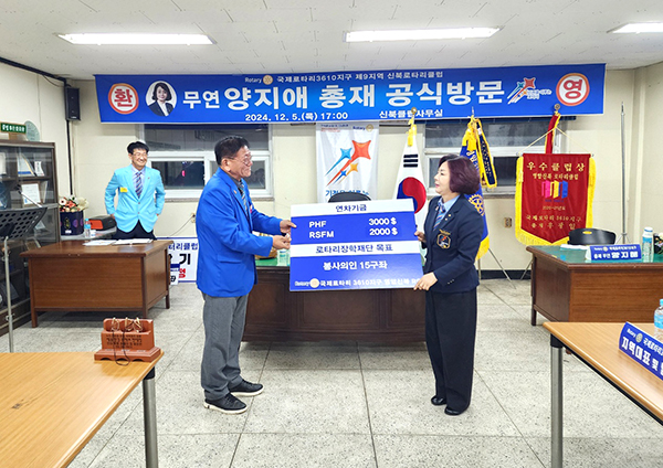 로타리클럽 3610지구 양지애 총재가 12월 5일 오후 5시 신북 로타리클럽(회장 유영기)을 방문, 우수회원 표창과 함께 RFSM(국제봉사기금) 300달러를 기증했다.