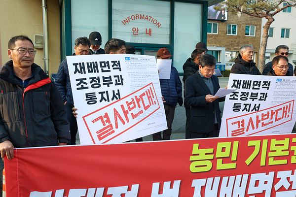 지난해부터 모든 벼 농가들을 대상으로 ‘벼 재배면적 조정제’가 시행된 가운데 영암군농민회와 영암군쌀생산자협회는 지난 14일 군청 앞에서 기자회견을 갖고 벼 재배면적 조정제는 농민들의 기본권을 심각하게 침해하고 농업의 근간을 위협한다며 강하게 비판했다.