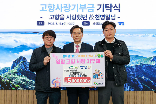 제주항공 여객기 사고 희생자 고 천병일 씨의 동생 병현 씨가 큰형인 병갑 씨와 함께 15일 영암군을 찾아 고인의 이름으로 고향사랑기부금 500만원을 전달했다.