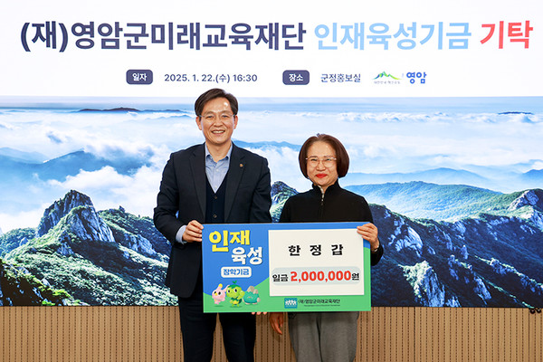 시종면 한정갑·이선숙 부부가 지난 달 22일 영암군미래교육재단에 인재육성기금 200만 원을 기부했다.