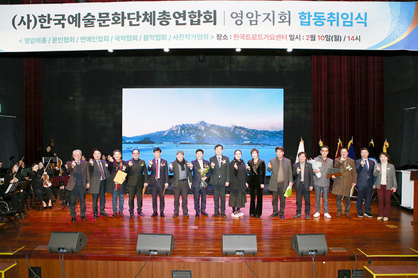 (사)한국예술문화단체총연합회 전라남도연합회 영암지회(이하 영암예총) 합동 취임식이 10일 한국트로트가요센터에서 한국예총 조강훈 회장, 임점호 전남연합회장을 비롯한 예술계 인사, 윤재광 영암 부군수, 박종대 의장, 김광수 교육장 등 각계에서 200여 명이 참석한 가운데 개최됐다.