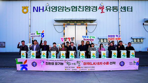 서영암농협(조합장 김원식)이 18일 고유브랜드인 친환경 유기농 ‘학이 머문 쌀’ 10톤을 미국 LA로 첫 수출을 시작했다.
