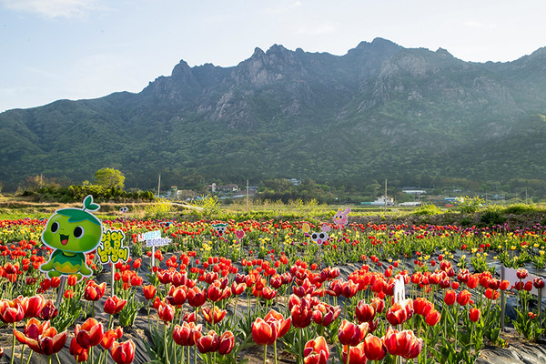월출산 아래 형형색색의 튤립 - 국립공원 월출산을 병풍 삼은 영암읍 월비마을 앞 들녘의 빨강·보라·노랑 튤립들이 싱그럽다. 영암군은 올봄 상춘객을 위해 지난해 12월 린반덴마크 등 6종의 튤립 8천본을 심어 현재 꽃이 절정을 이루고 있다.