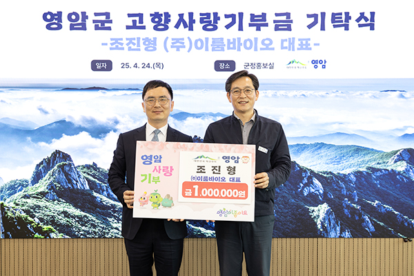 ㈜이룸바이오 조진형 대표가 24일 영암군을 찾아 고향사랑기부금 100만원을 기탁했다.