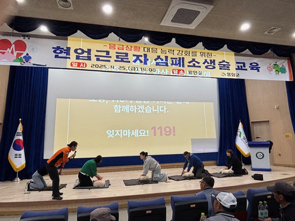 영암군은 지난 4월 25일 군청에서 현업근로자 150여 명이 참석한 가운데 심폐소생술 교육을 실시했다.