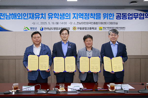 영암군이 19일 전남이민외국인종합지원센터, 영암교육지원청, 구림공고 등과 지역 유학생의 안정 정책 지원을 내용으로 민·관·학 공동업무협약을 체결했다.