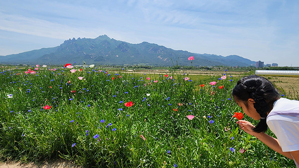 월출산을 병풍 삼은 영암천 1.8km 구간에 수레국화·꽃양귀비·안개초가 만개하여 행인들의 눈길을 끌고 있다.