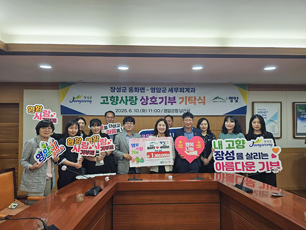신정숙 장성군 동화면장은 “영암군과 고향사랑기부로 교류협력의 물꼬를 터서 기쁘다. 이번 상호기부가 두 지역의 우호와 협력을 더 돈독히 하는 계기가 되길 바란다”고 말했다.