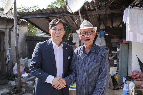 우 군수는 어르신의 마디마디 굽은 손가락을 어루만지며 그날의 헌신에 고마움을 전했다. 조 어르신은 “내가 이렇게 건강하게 살아있는 것도 다 국가 덕이다”고 화답했다.