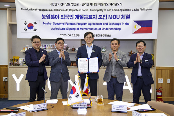 영암군은 지난 6월 26일 필리핀 제너럴 에밀리오 아기날도시 및 캄보디아 노동직업훈련부와 외국인 계절근로자 교류에 관한 양해각서 협약(MOU)을 체결했다.