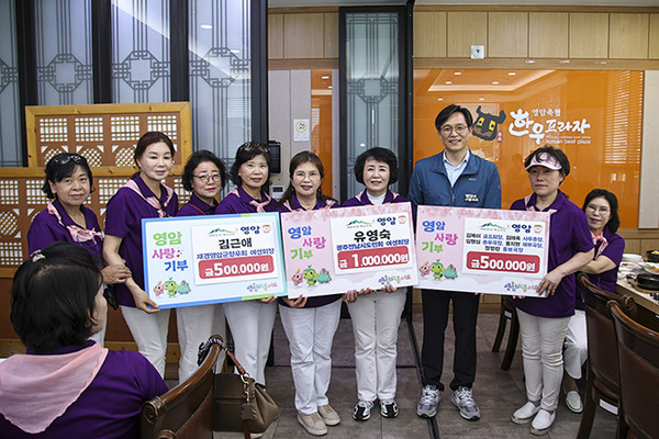 영암읍 축협한우플라자에서 열린 고향사랑기부금 전달식에서 유영숙 회장, 김근애 영암군여성회장을 포함한 여성회 임원들은 십시일반으로 모은 성금을 영암군에 전했다.