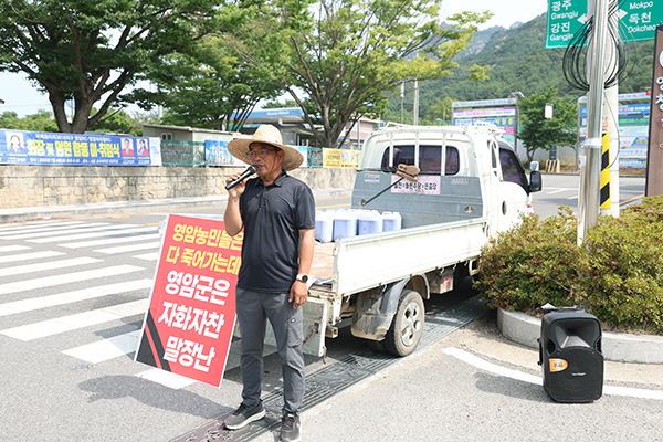 민선 8기 3주년을 맞아 영암군이 개최한 군수와의 토크콘서트 ‘우퀴즈 in 영암’ 행사장 앞에서 농민을 대표해 1인 시위에 나선 이가 있어 이목을 끌고 있다.