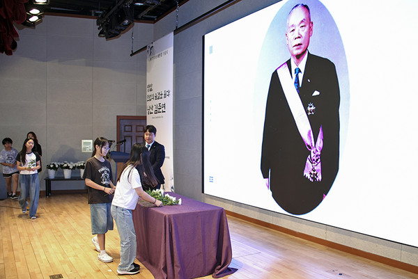 낭산 선생은 기념식에서 인공지능(AI) 기술의 도움으로 모교 후배들에게 웃으며 인사를 건네고 응원의 메시지를 보냈다.