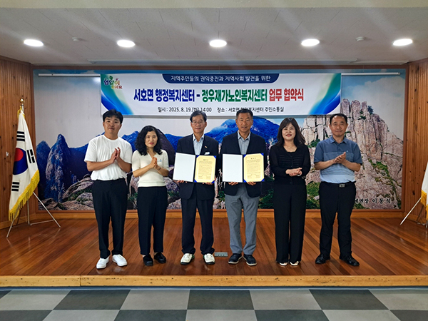 서호면은 정우재가노인복지센터와 19일 행정복지센터에서 업무협약을 맺고, 지역사회 발전과 복지자원 연계 등에 협력하기로 했다.