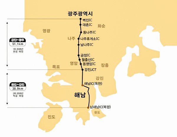 당초, 광주~완도 간 고속도로는 한 번에 건설하는 방향으로 추진됐으나 경제성(B/C) 확보에 어려움을 겪어 단계적으로 추진하게 됐다. 지난 2017년 착공한 1단계 광주~강진(51.1㎞) 구간은 8월 말 현재 공정률 82%를 보이고 있는 가운데 2026년 말 준공 예정이다.