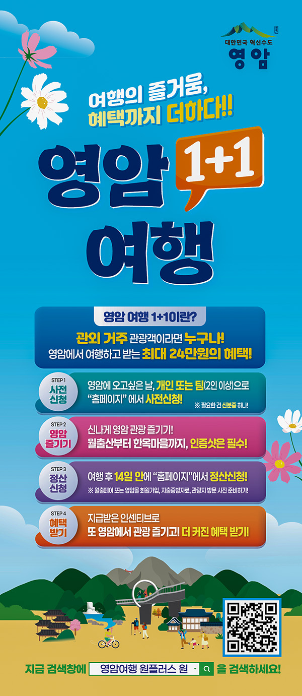 관광객의 경제적 부담을 낮추고, 재방문을 촉진해 지역경제 활성화를 견인하는 맞춤형 인센티브 제도인 영암여행 원플러스원 사업은 2인 이상 팀이 영암에서 여행하고, ‘영암여행 원플러스원’ 홈페이지에 관련 서류를 올리면 1회차 5만원, 2회차 7만원, 3회차 10만 포함 최대 24만원 상당을 제공한다.