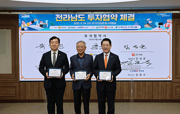 24일 전라남도청에서 전라남도와 영암군이 ㈜해진수산, ㈜해진식품과 투자협약을 체결하고 협력을 약속했다.