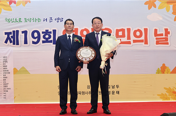 박도상(63·사진 오른쪽) 영암농협 조합장이 지난달 26일 개최된 영암읍민의 날 행사에서 ‘영암읍민의 상’을 수상했다.
