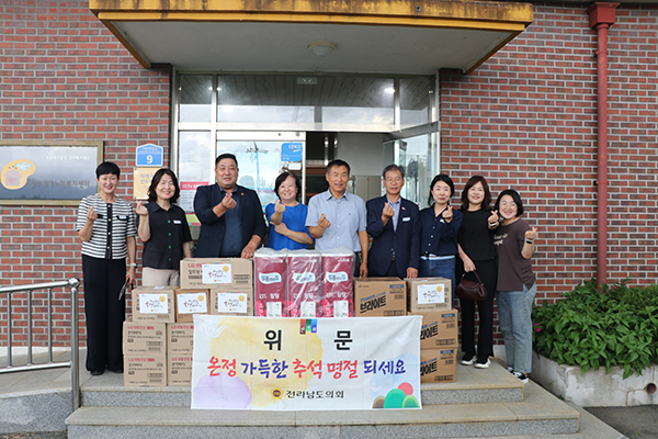 전라남도의회 손남일 의원(영암2, 더불어민주당)은 추석 명절을 앞둔 지난달 24일 서호면 사랑의 집과 정우재가노인복지센터를 찾아 도의회에서 마련한 위문품을 전달하고 입소 어르신과 종사자들에게 따뜻한 추석 인사를 전했다. 아울러 시설 종사자들과의 간담회를 통해 복지 현장의 어려움을 청취하고 처우 개선과 지원 확대 방안에 대해 논의했다.