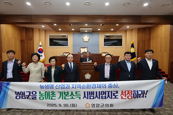 영암군의회는 지난달 30일, 본회의장에서 의원 8명 전원이 참석한 가운데 ‘농어촌기본소득 시범사업지 영암군 선정 촉구 건의문’을 발표했다.