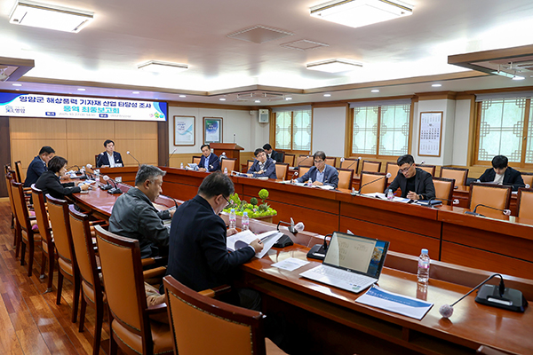 영암군은 27일 낭산실에서 ‘해상풍력 기자재 산업 클러스터조성 타당성 조사용역 최종 보고회’를 가졌다.<사진>