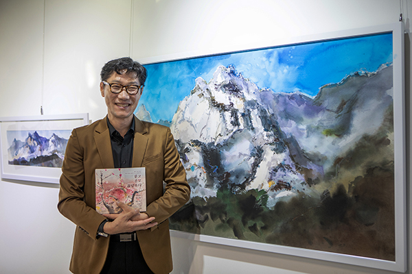 ‘겨울의 월출산-Ш’ 앞에서 포즈를 취한 신 작가는 “월출산을 많이 그렸지만 제대로 표현하기가 쉽지 않다”면서 “더 많이 살펴보고 더 깊이 소통하는 시간을 가져야겠다”고 말했다.