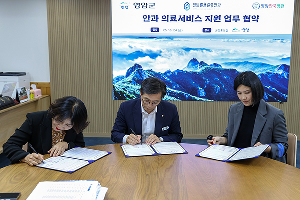 영암군은 24일 낭산실에서 센트럴윤길중안과, 영암한국병원과 ‘백내장 수술지원 민관 협약식’을 체결했다.