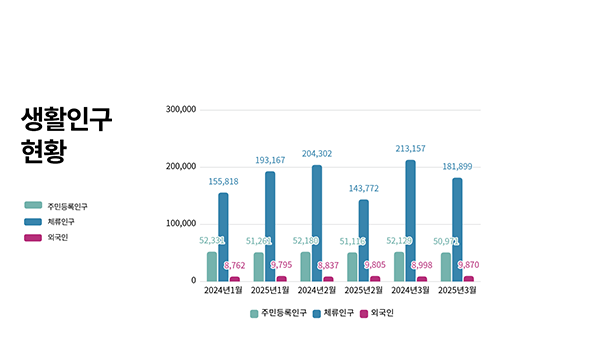 이는 지난해 같은 기간 ▲1월 15만5천818명 ▲2월 20만4천302명 ▲3월 21만3천157명로 나타났으며, 특히 2~3월 체류 인구는 3만 명 이상 급감한 수치다.